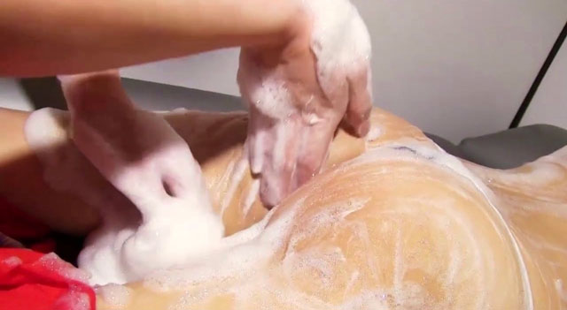 洗面器にボディソープを垂らして泡立て、その上からローションを少し加え、さらに泡立てます。すると、独特の粘り気と弾力があってすぐには泡が消えないホイップが出来上がります。それを密着しながら男性キャストが足から首まで全身をくまなく洗います。